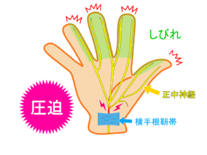 圧迫される神経は正中神経(せいちゅうしんけい)という神経で、主に人差し指と中指の感覚や動きに関与しています。