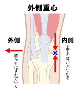 膝の内側が痛くなると、庇って外側重心が強くなる。そして更に内側の軟骨がすり減っていく・・・という悪循環へと陥ります。