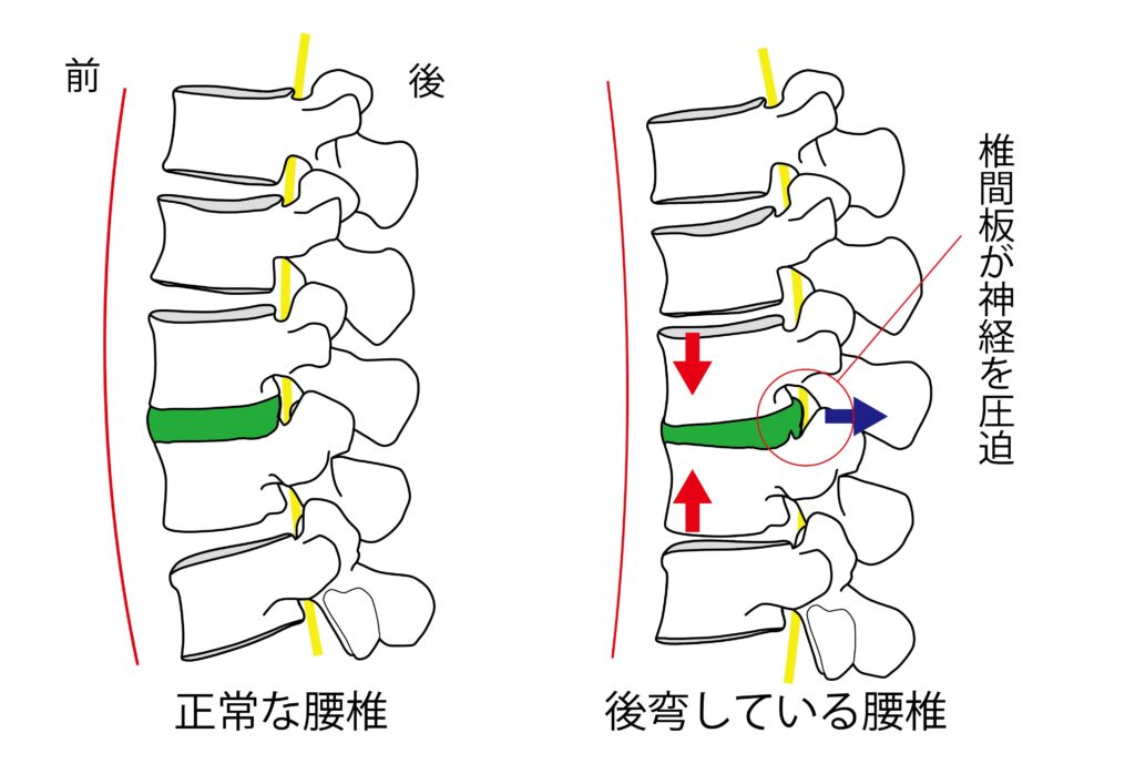 特に腰椎が後弯している(腰が丸くなっている)場合、上下の腰椎により椎間板の前面が圧迫され、椎間板の中身(髄核)が後ろにはみ出ます。これが神経を圧迫することによりヘルニアの症状が現れます。