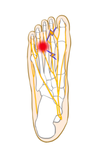 モートン病は、主に足の中指と薬指、または薬指と小指の間に起こりやすく、神経が圧迫・刺激されることで痛みや違和感が生じる疾患です。特に女性に多く、ヒールやつま先の細い靴を履く習慣がある方に見られやすい傾向があります。