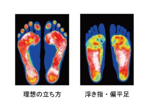 オスグッド・シュラッター病になった方たちに共通する特徴として、踵重心(浮き指)が挙げられます。とくにスポーツは母指球(足の親指の付け根)で動くことが多く、普段の生活でも足の指を浮かせてしまいやすくなります。本来人間は重心が前の方にあるので前に倒れないように脚の裏側の筋肉を使って立ちます。踵重心になると後ろに倒れないように脚の前側、特にももの前の筋肉を使って立ってしまいます。そうすると普段からももの前の筋肉が固くなり、スポーツでのジャンプやダッシュの際に固いももの筋肉が強く脛の骨(脛骨粗面)を引っ張ってしまいます。