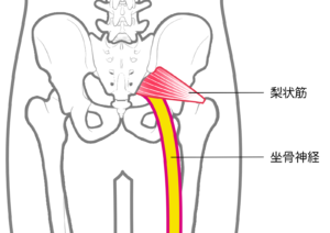 坐骨神経痛の主な原因として代表的なのが、お尻にある梨状筋(りじょうきん)という筋肉に坐骨神経が圧迫されることです。