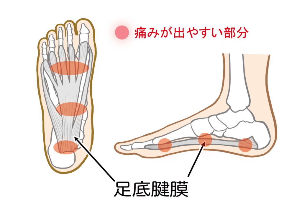 近年多くみられるのが、浮き指による足底腱膜炎です。足の指が地面に着いていないと本来指が支える体重の重さを、足底腱膜が支えなくてはならなくなります。結果負担が大きくなった足底腱膜が固くなり、痛みを引き起こしてしまいます。